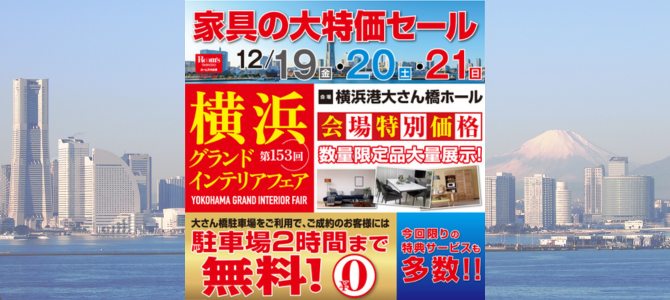ルームズ大正堂が「第153回横浜グランドインテリアフェア」を  12月19日(金)~21日(日)の3日間、横浜港大さん橋ホールで開催。  国内外の有名ブランド家具が大変お得にお買い求め頂けるチャンス! ベルスファミ...
